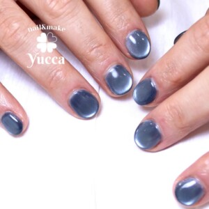 「紺色が好き」「ジムのお客様がされていたマグネットネイルが素敵で、憧れていた」というキーワードを引き出し、深いネイビーのマグネットネイルをご提案しました。