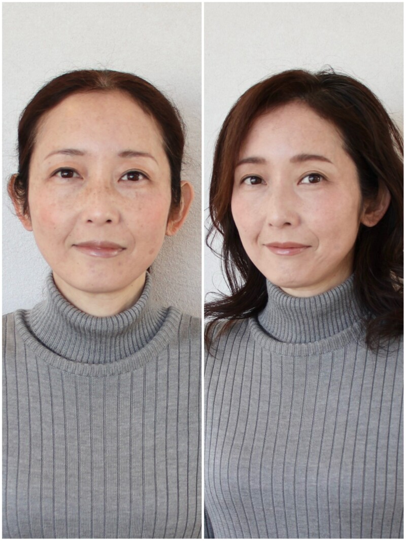 ファンデーションの色選びと塗り方を見直すだけで、若々しく健康的な印象へと大きく変化しました。